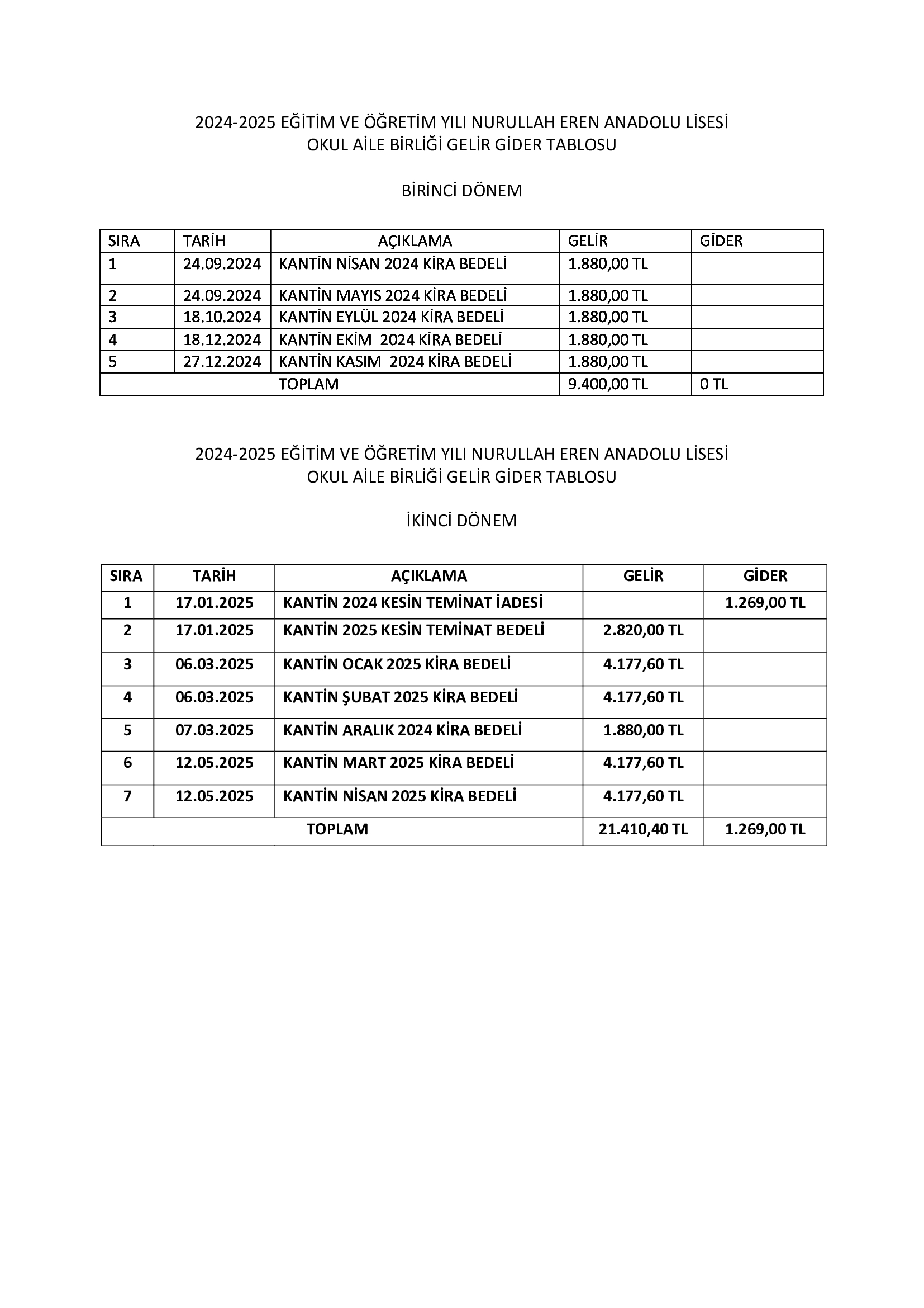 OKUL AİLE BİRLİĞİ GELİR GİDER TABLOSU